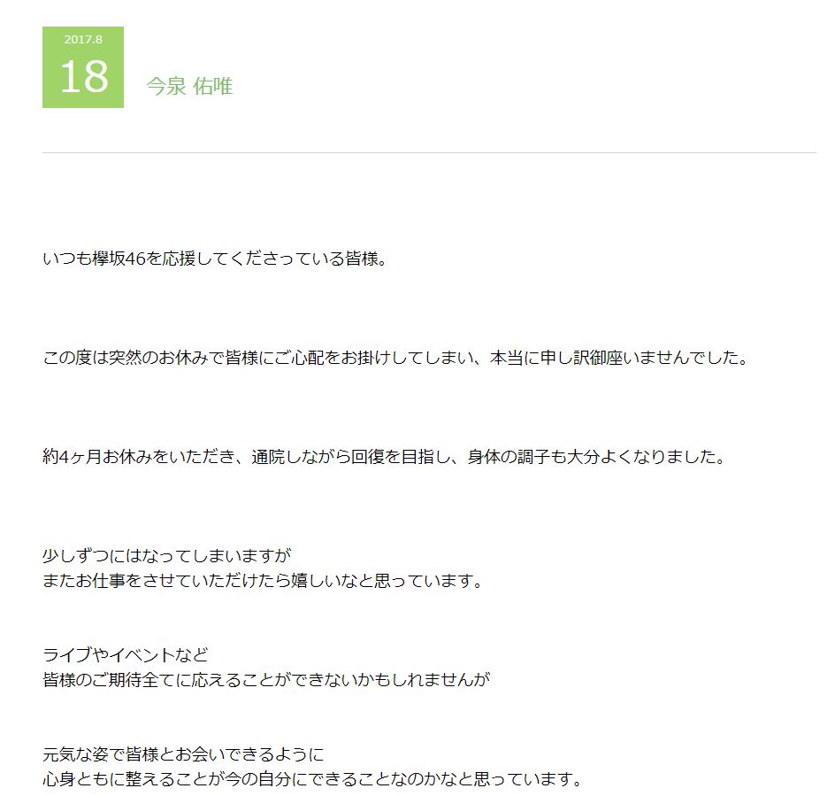 欅坂46 今泉佑唯がブログで活動再開を発表!