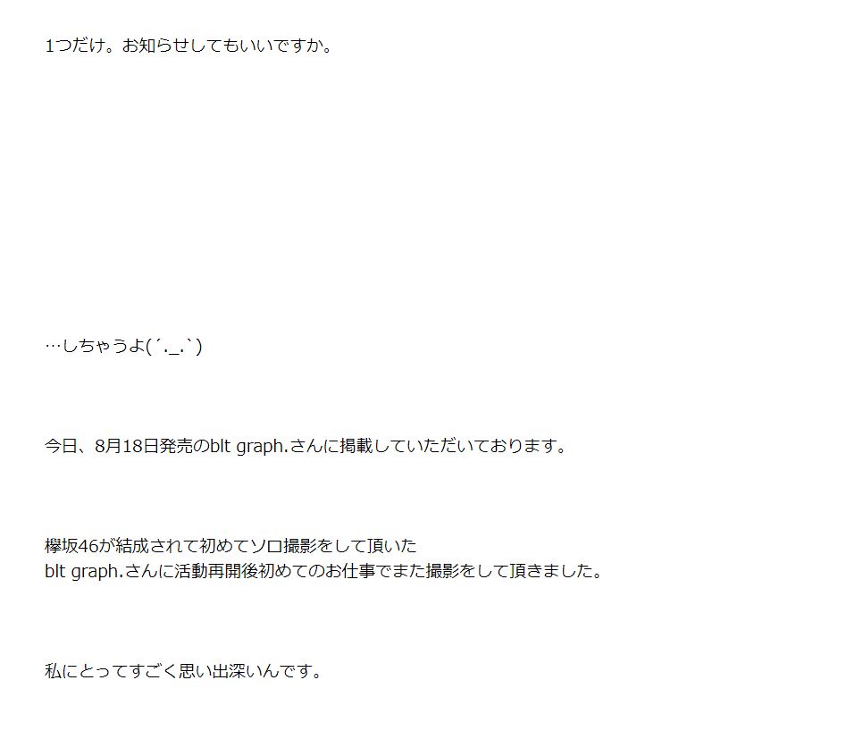 欅坂46のメンバーである今泉佑唯さんが本日公式ブログを更新し、活動を再開することを発表致しました。