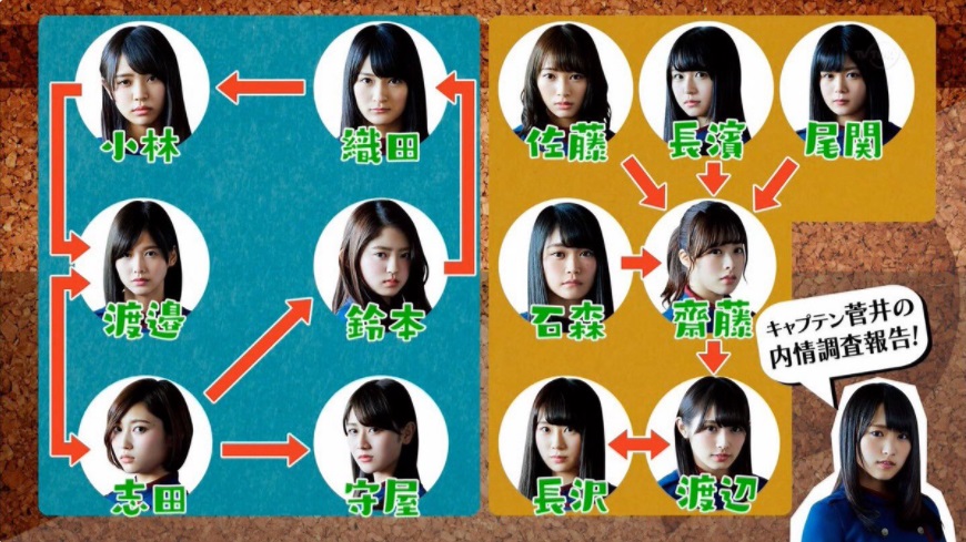 本日放送の「欅って、書けない?(けやかけ)」にて、欅坂46メンバー内での相関図が判明しました!これまでの放送では鈴本美愉さん→織田奈那さん→小林由衣さんの三角関係が発覚しておりました。今回はグループ内恋愛事情を把握するため、キャプテンの菅井友香さんが内情調査を報告しました。