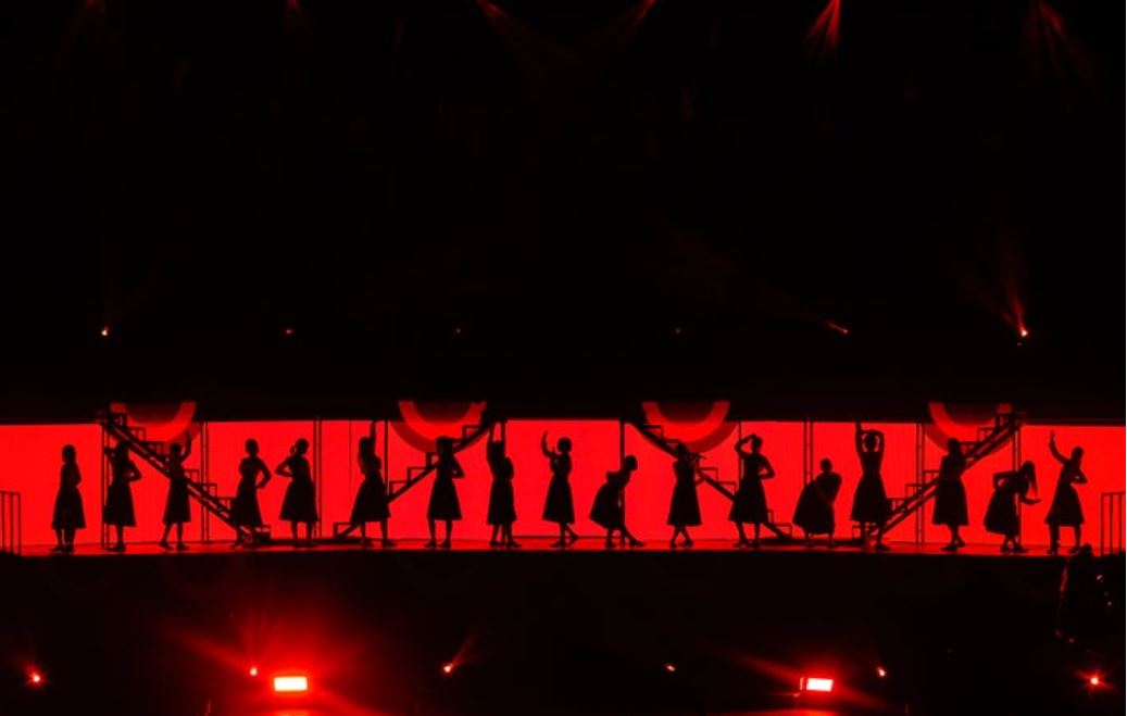 中央ステージに水が張られ、齋藤冬優花さん、石森虹花さん、鈴本美愉さん、小林由依さんの4人がキレのあるダンスを披露。