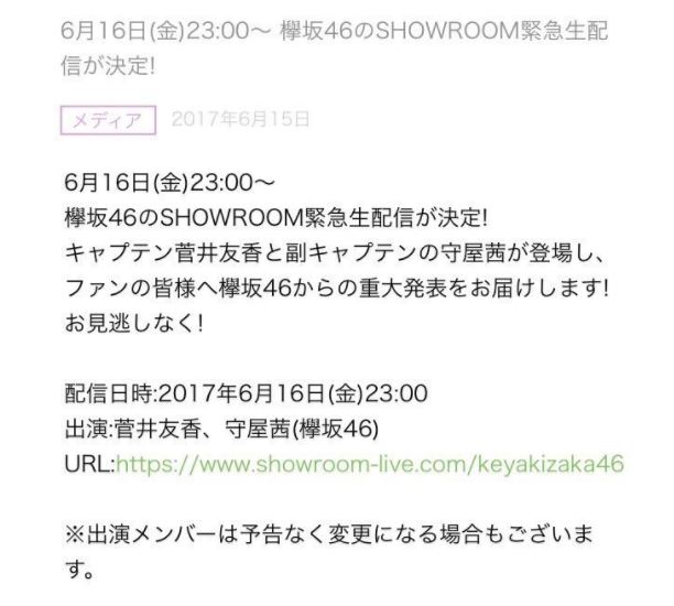 欅坂46 SHOWROOM緊急生配信決定! 重大発表とは?