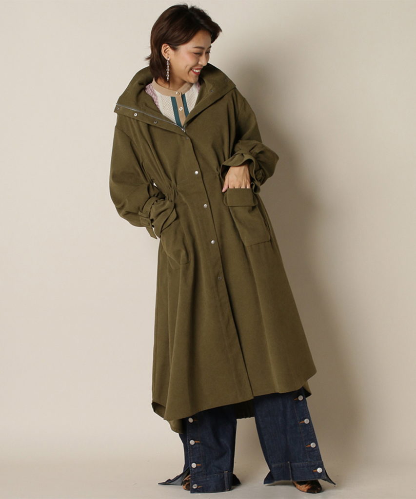 緑のラインがポイントのブラウスにカーディガン、さらにモッズコートを羽織っています。