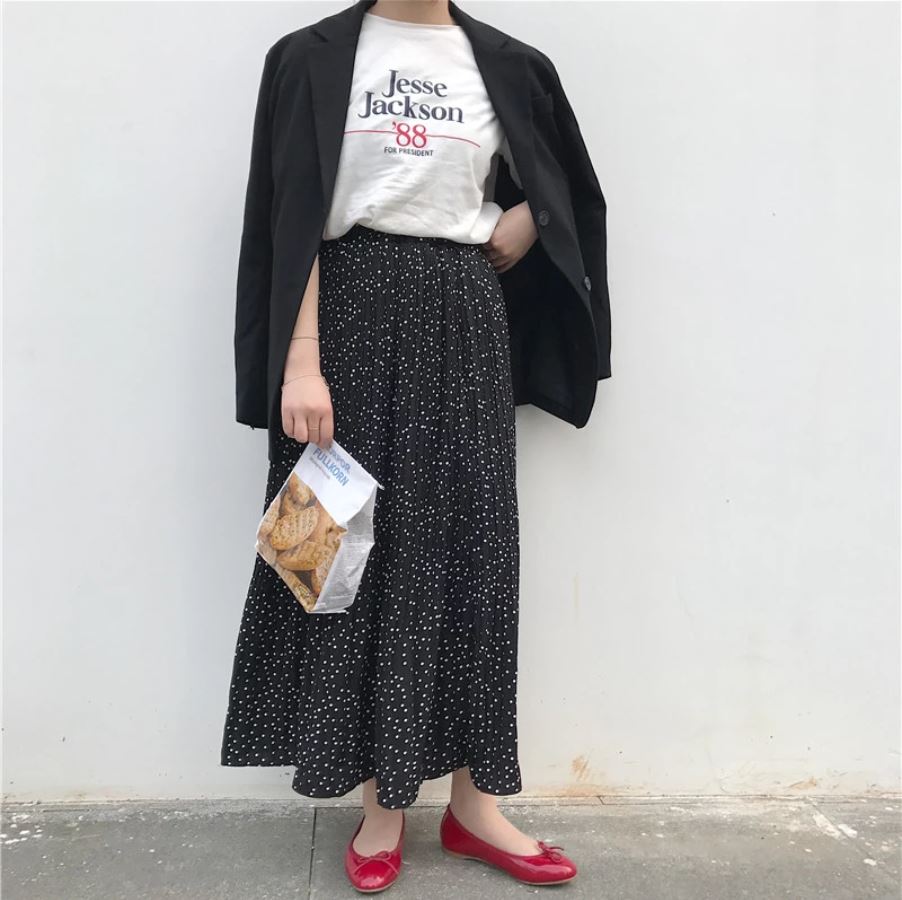 下はふわりと揺れるドットのスカートを合わせ、可愛いポイントも忘れていないですね!